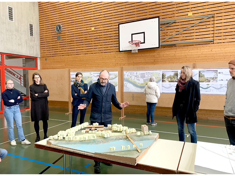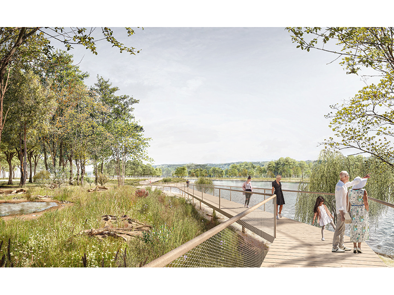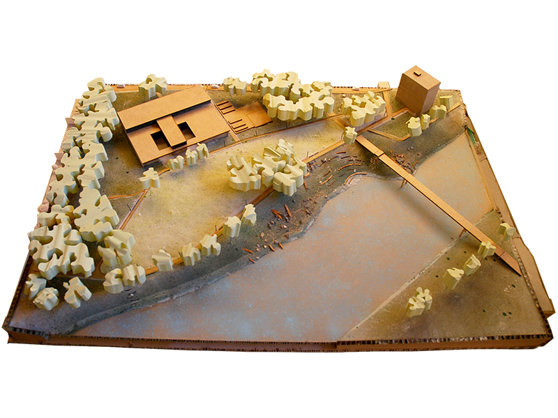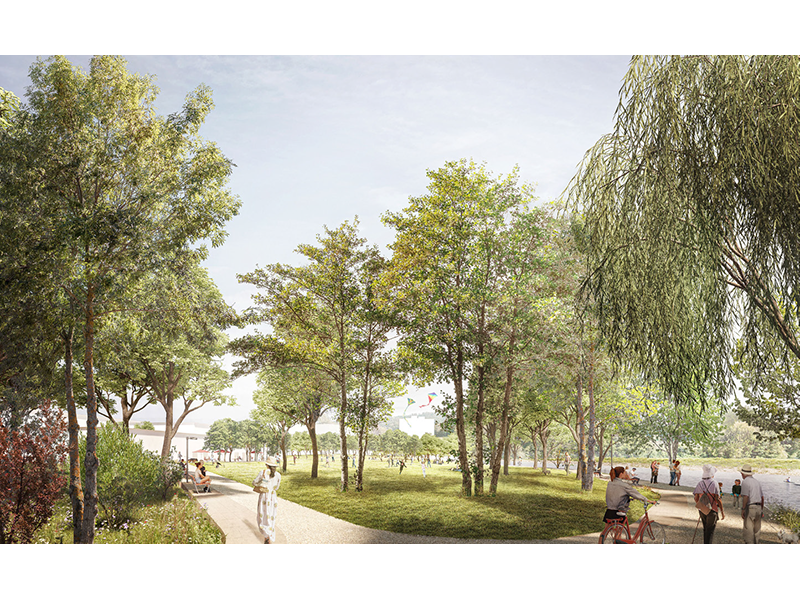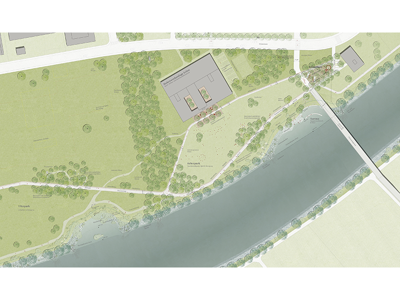 Unter dem Titel ‚open Brügg’, verfolgt das Planungsteam das Ziel, einen nutzungsorientierten Park für unterschiedlichste Akteure und Bedürfnisse zu schaffen. Das Grundgerüst bildet die Überlagerung mehrerer grossräumiger Landschaftselemente. Wiesenflächen, Waldhaine, Gartenzimmer und Flachuferzonen werden über ein differenziertes Parkwegesystem erschlossen und erlebbar gemacht. Das vorgeschlagene Konzept bezieht den umliegenden Bestand mitein und bietet Möglichkeiten für die ökologische Quervernetzung und Wegbezüge in die angrenzenden Quartiere. Der Erlenparkweg bildet das Rückgrat der Erschliessung des Konzeptperimeters. Im Osten bildet der Erlenplatz einen Eingangs- und Empfangsbereich. Ausgehend vom Platz bildet er im Erlenpark einen grossen «Loop» um die zentrale Wiesenfläche. Von hier aus führt er durch den Erlenwald in den Uferpark, mal nahe, mal weit weg vom Wasser, führt durch Waldhaine, entlang entlang der Gartenanlagen und erzeugt dadurch vielfältige Blickbezüge und ein abwechslungsreiches Raumerlebnis. Die Verzahnung von Wasser und Land erfolgt an drei Stellen in Form organisch modellierter Einbuchtungen, welche differenziert zugänglich sind. Die Lebensraumvielfalt im Uferbereich wird mit den aquatischen und terrestrischen Massnahmen markant erhöht. Dazu gehört das schlüssige und detaillierte Vegetationskonzept, welches auch wesentlich zur terrestrischen Vernetzung beiträgt. Zentrales Element im Bereich des Spitalneubaus sind die sogenannten «Gartenzimmer». Die bestehenden, privaten Familiengärten werden im Rahmen eines sorgfältig geplanten Entwicklungsprozesses in zwei öffentliche, je von einem Waldhain umgebene Gartenzimmer transformiert. Trotz dem plausiblen Konzept der Überlagerung klar definierter Freiraumelemente gelingt es zu wenig, dieses Grundgerüst in einen verbindenden gestalterischen Ausdruck zu überführen. Wichtige Elemente wie die wasserbaulichen Massnahmen im Uferbereich des Kanals oder die Transformation der Familiengärten wirken gestalterischein wenig isoliert. Die Vielfalt der Themen in unterschiedlichen Formsprachen schwächt die ursprüngliche Idee einer starken Gesamtfigur. Dies widerspiegelt sich auch in der modularen Etappierung, welche die Reihenfolge der verschiedenen Interventionen der urbanen Entwicklung überlässt, anstatt sie zum Anlass zu nehmen, städtebauliche Eckpunkte zu setzen. Die intensive, wenig flexible Nutzung im Bereich der Gartenzimmer und die Wegführung in unmittelbarer Nachbarschaft zum Spitalneubau bergen ein gewisses Konfliktpotenzial. Zur Koexistenz Fuss- und Veloverkehr werden keine differenzierten Aussagen gemacht. Der mäandrierende Wegverlauf ist für das Parkerlebnis zwar von Vorteil, für eine schnelle Verbindung West-Ost aber eher ungeeignet. Der Erlenpark, bestehend aus einer grossen Parkwiese mit Ankunftsplatz und Arena am Brückenkopf, fügt sich landschaftlich und räumlich gut in das Gesamtkonzept ein. Im Entwurf wird jedoch der räumliche Bezug zu den in diesem Parkabschnitt vorhandenen Bauwerken und Bebauungen hinterfragt. Die Lage des Erlenplatzes in unmittelbarer Nähe zu einem Wohngebäude scheint problematisch. Als Empfangsort ist der Platz attraktiv, in Bezug auf den Park ist die Lage jedoch peripher und an der Schnittstelle zweier wichtiger Fuss und Veloverbindungen drohen Konflikte. Die zum Kanal ausgerichtete Mehrzweckanlage wird dem Park untergeordnet. Sie wird zwar zur Wiese adressiert, die Verknüpfung erfolgt jedoch nur über die Terrasse. Der räumliche Bezug und die Verbindung zum Flussraum fehlen. Die schwache Integration in den Park wird dem Gebäude, seinem Volumen, seinem architektonischen Ausdruck und seinem Potenzial für die Parknutzung nicht gerecht.