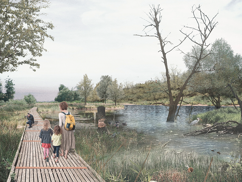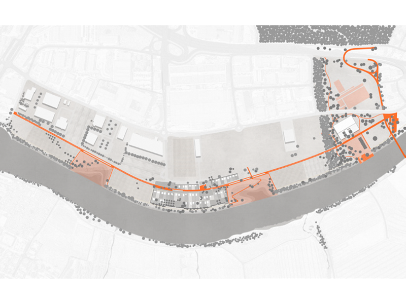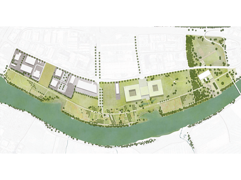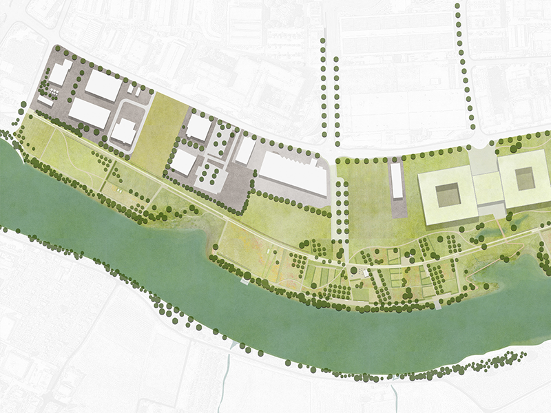 Die Mehrzweckanlage wird für die Parknutzung geöffnet. Der grosszügige Vorplatz erstreckt sich bis zum Ufer und stellt den direkten Bezug zum Fluss her. Die hainartig auslaufende, erweiterte Waldzunge erzeugt eine selbstverständliche räumliche Fassung des Platzes. Östlich davon befindet sich eine grosse Spiel- und Liegewiese, nördlich ein Spielplatz in einem Kiefernwäldchen, wodurch ein breites Nutzungsangebot entsteht. Der aufgeschüttete Hügel im nördlichen Teil besteht aus Aushubmaterial der Landschaftsfenster und dient als erhöhter Damm für die neue Veloschnellroute. Er ist aber auch eine spannende Inszenierung des räumlichen Abschlusses des Parks. Zusammengehalten und erschlossen wird das vorgeschlagene Parksystem durch ein klar hierarchisiertes Wegenetz. Dieses besteht aus einem neu angelegten Hauptweg, der «Promenade», die als eigentliches Rückgrat des Parks durch den gesamten Perimeter verläuft und als schnelle Haupterschliessung und übergeordnete Wegverbindung für Fussgänger:innen und Velofahrende dient. Ein zweiter, untergeordneter Weg verläuft entlang der Uferkante, ergänzt durch zahlreiche Querverbindungen, die zusammen ein engmaschiges Wegenetz ausbilden. Diese beiden Wegsysteme unterstreichen die Weite und Offenheit der Ebene, ermöglichen aber gleichzeitig ein situatives Eintauchen in strukturreiche, kleinteiligere Abschnitte. Dies ergibt eine abwechslungsreiche Choreografie durch die vielfältige Uferlandschaft. Ein präzises Gestaltungsrepertoire hilft, den gesamten Uferpark als zusammengehörige Einheit zu lesen und eine eigene Identität zu entwickeln. Der integrative, gesamtheitliche und prozessuale Ansatz des Konzeptes wird gewürdigt. Insbesondere der Fokus auf behutsame Transformation des Bestehenden, das Zulassen einer offenen und dynamischen Entwicklung der Teilbereiche inkl. Werkzeugkastenprinzip sowie der modulare Aufbau der einzelnen Abschnitte überzeugt, da dieser eine hohe Umsetzbarkeit und Flexibilität verspricht. Die aufgezeigte Etappierung ist sehr plausibel. So überzeugt die Gesamtkomposition sowohl als ökologisches Lebensraummosaik wie auch als räumlich-atmosphärisches Erlebnis für Parkbesuchende, denen ein breites Angebot an Nutzungsmöglichkeiten präsentiert wird. Gleichzeitig besticht der zurückhaltende und sorgfältig ausgearbeitete Projektvorschlag durch eine angemessene Eingriffstiefe und einen innovativen Umgang mit den Themen Boden, Klima und Landwirtschaft.