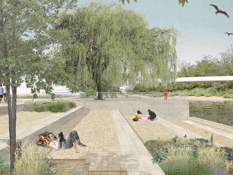 Als Würdigung des historischen Infrastrukturbauwerks wird die lineare Uferkante des Nidau-Büren-Kanals mehrheitlich erhalten und mittels uferbegleitendem Weg inszeniert, jedoch an zwei Stellen durch sogenannte «Landschaftsfenster» unterbrochen. Die beiden organisch geformten Buchten mit Vorschüttungen und Flachwasserzonen bieten interessante landschaftliche Ein- und Ausblicke und schaffen wertvolle Lebensräume, gleichzeitig reichern sie als «Störungen» das Gesamtsystem räumlich und atmosphärisch an. Während das östliche Landschaftsfenster durch einen Steg begehund erlebbar gemacht wird, bleibt das westliche ein unzugängliches strukturreiches Vorranggebiet für eine artenreiche Flora und Fauna. Der Erlenpark ist als funktionaler Bestandteil und räumlicher Auftakt des Gesamtparks konzipiert. Als multifunktionaler Treffpunkt schafft er eine Zentralität und eine hohe Aufenthaltsqualität am Wasser.